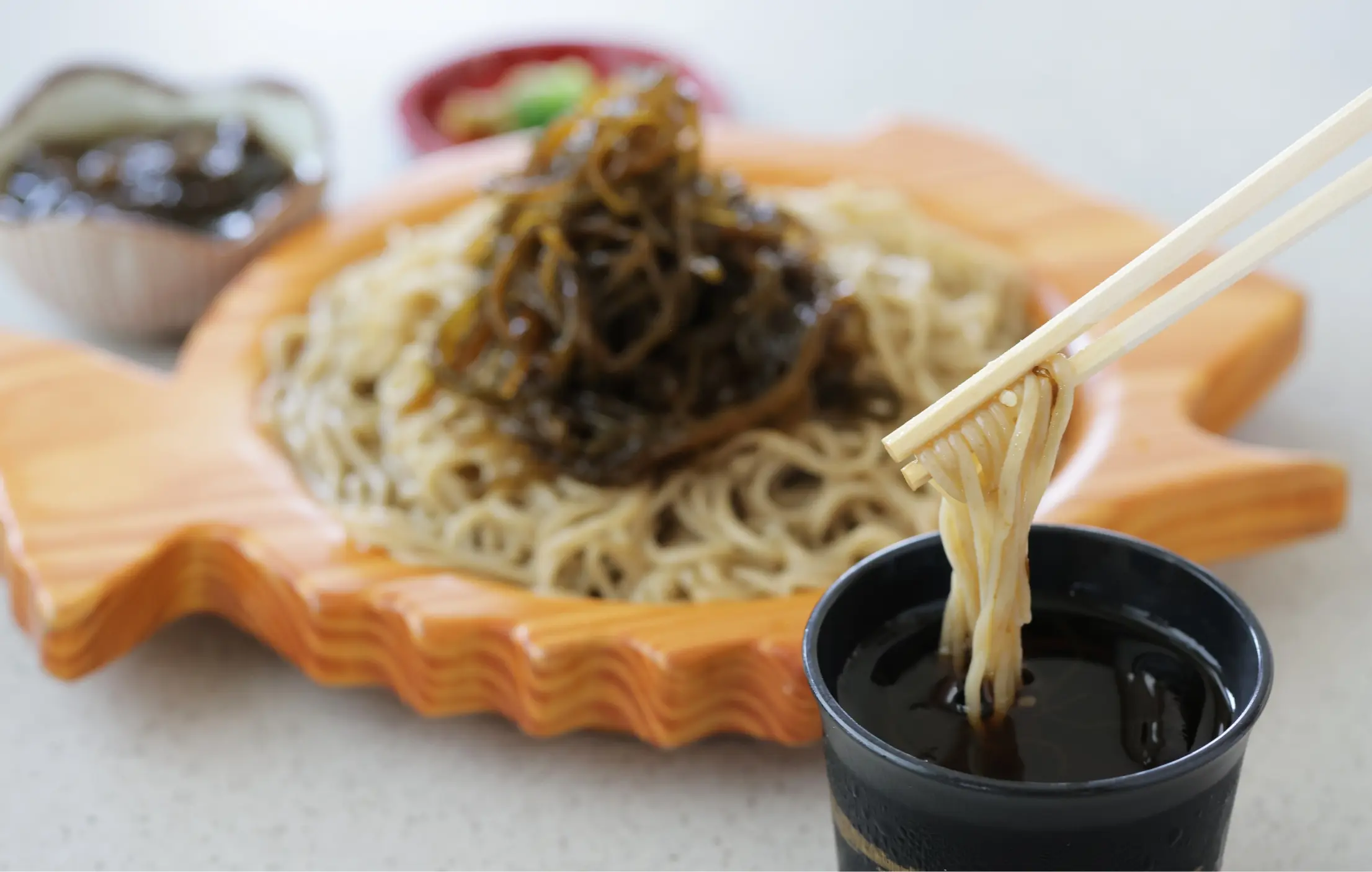 The rich and flavorful spear squid tantanmen noodles is one if the menu highlights. The minced, spicy squid topping is addictive! Another must-try is cold soba, made with noodles kneaded with mozuku seaweed, topped with even more mozuku—perfect for this seaweed’s famous production area.