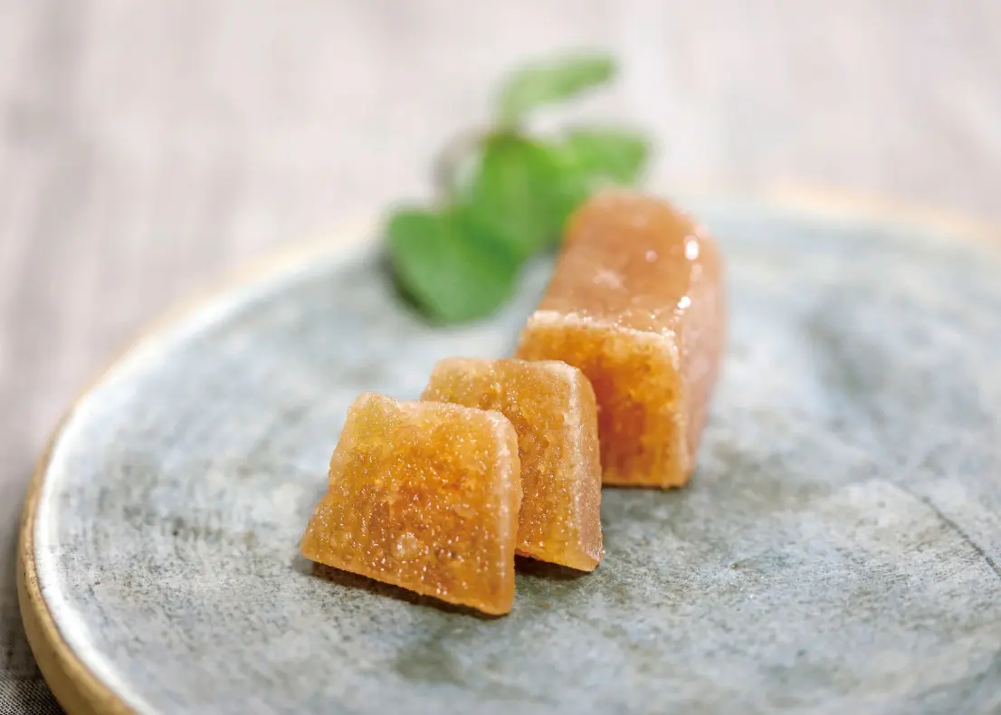 At EICHIN, a sweets shop in a traditional house on a quiet lane below Shuri Castle, tōgan-zuke appears as a charming topping for ice cream served with bite-sized castella cake and purple sweet potato paste. When sunlight streams in through the window and catches the glistening pieces, it becomes a dessert you can’t help but photograph.