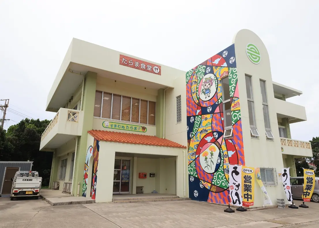 About a 20-minute drive from Tarama Airport, a colorful, mural-covered building suddenly comes into view in a quiet residential area. This is Sumamunu Tarama, a multi-purpose facility operated by the local tourism association. Bringing together a tourist information center, specialty shop, coworking space, and dining area, it functions like the island’s living room—warmly welcoming both residents and travelers.
