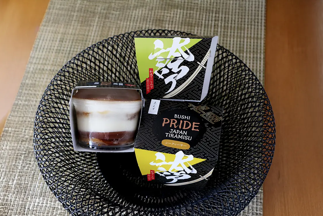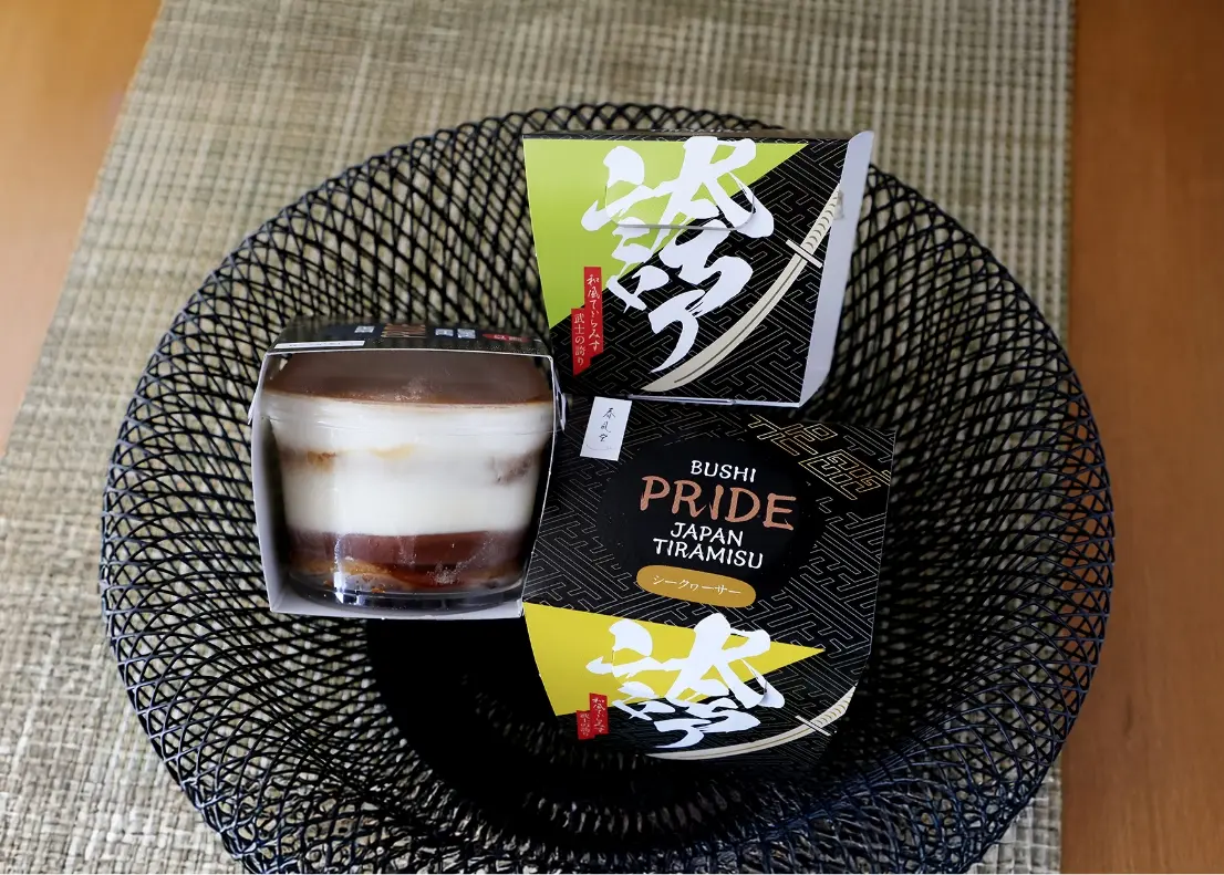 另一方面,位於沖繩市高原的「和菓子屋 春風堂」,以將沖繩食材融入日式點心的創意甜點廣受好評。將馬士卡彭起司、琉球肉桂(カラキ)、酸桔與黑糖完美融合的和風提拉米蘇,是一款從用湯匙劃開層層食材的瞬間起就會充滿愉悅體驗的匠心之作。這款將店鋪經典產品「銅鑼燒」、「羊羹」與沖繩食材創新結合的甜點,因其利落的外觀被命名為「武士的自豪」。