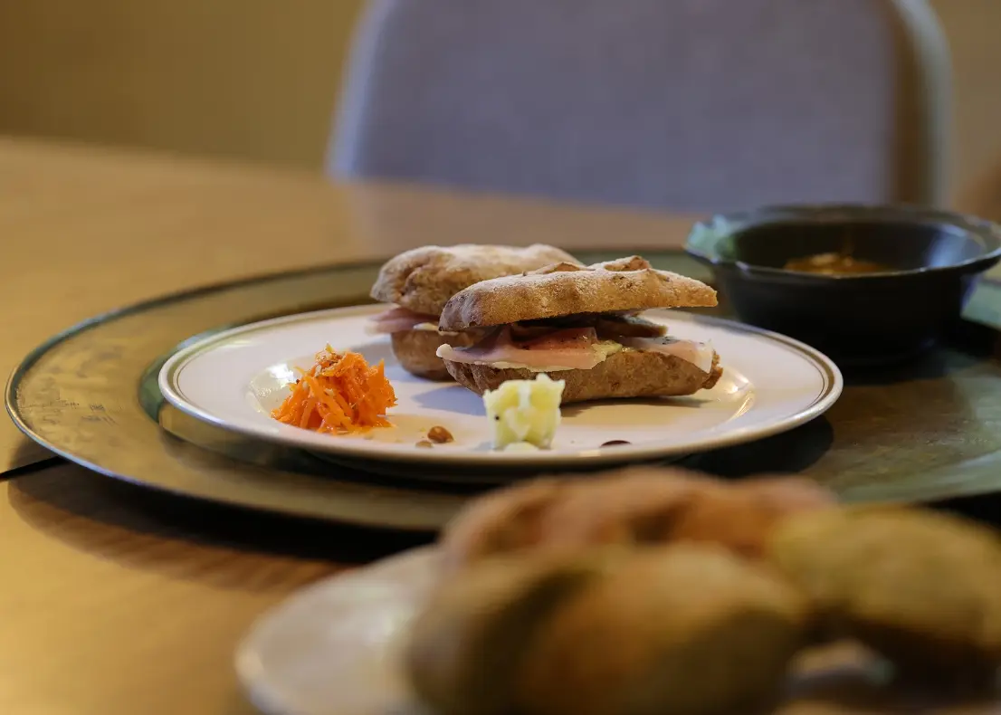 店內也提供豐富的三明治拼盤餐點。這一天選擇了「生火腿、藍紋起司與乾無花果三明治」。令人感到欣喜的是,店內同時也提供純素食餐點選擇。在保留外國人住宅風格的別緻空間裡,悠閒地享用一頓餐點,也是很推薦的體驗。