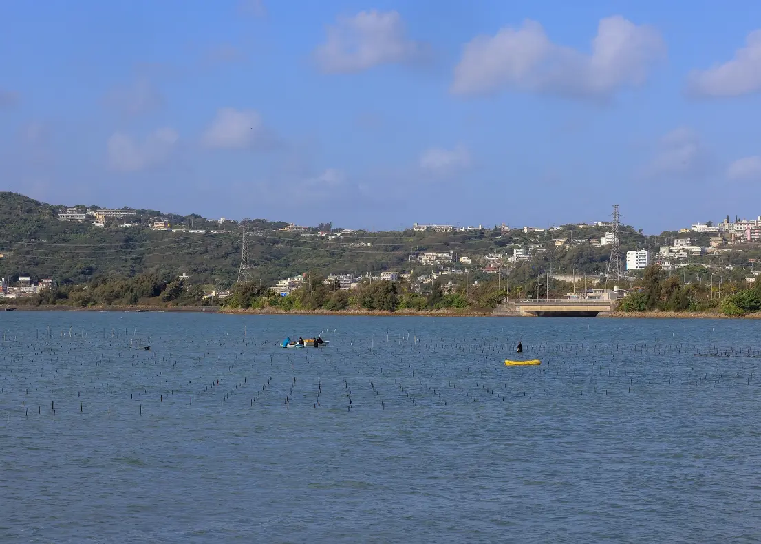 遼闊的北中城村坐落在俯瞰中城灣的高台上。這裡以世界遺產・中城城跡的城下町而聞名,平靜的海面與整齊的街道景觀延展開來,是一片風光明媚的地方。清晨的宁静中,這個村落的海面上正进行着海藻采收作业。
