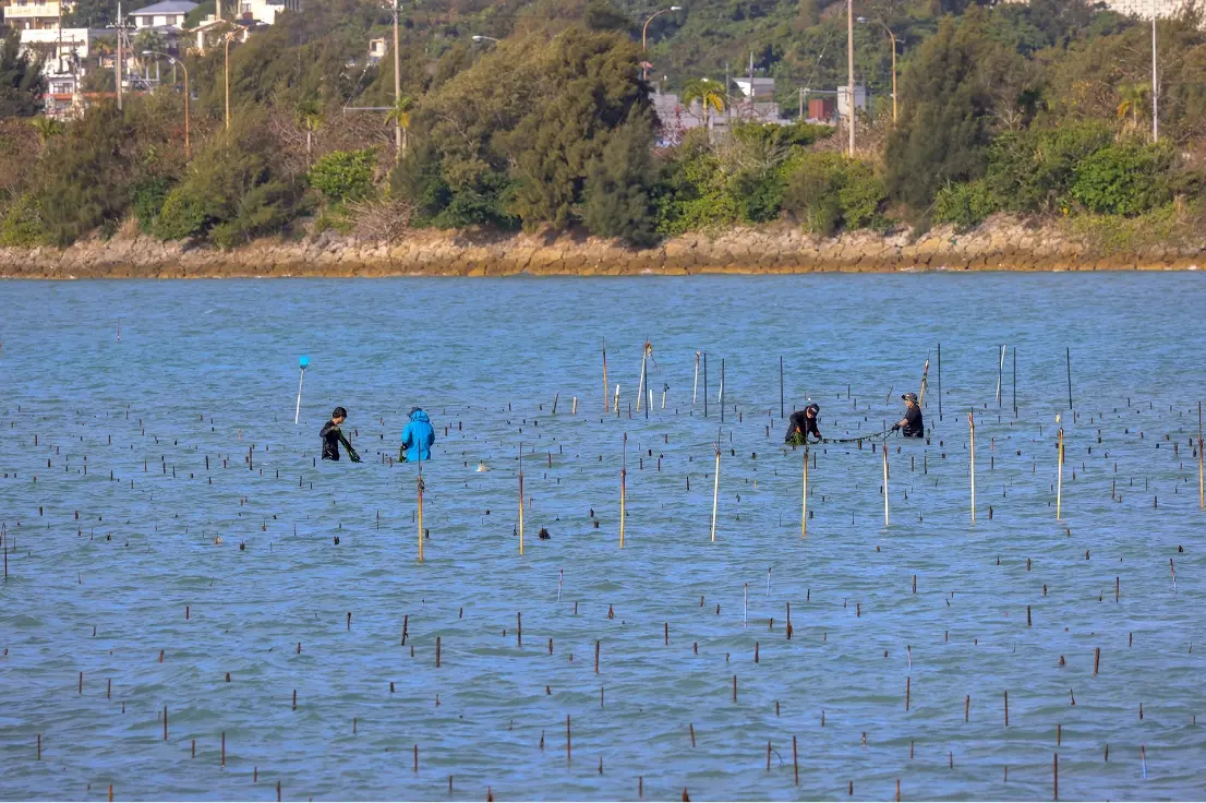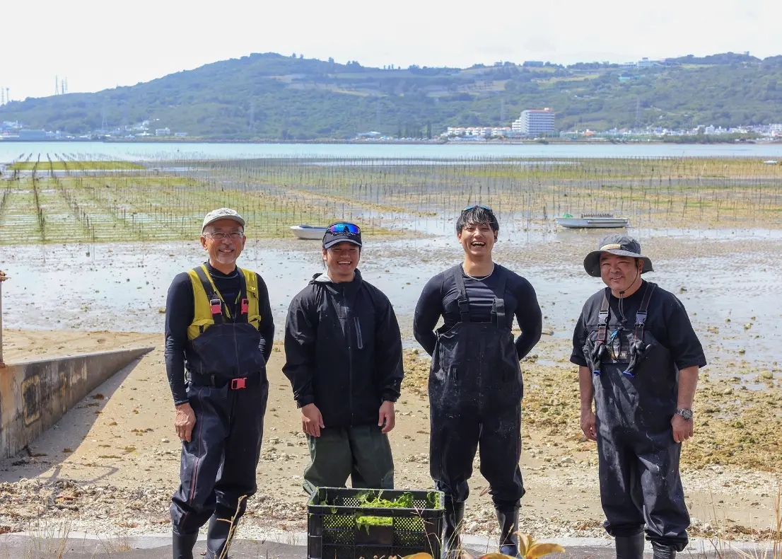 アーサ漁が行われるのは、例年3月ごろ。穏やかな海に鮮やかな緑が広がるこの季節は、沖縄に春の訪れを知らせる風景のひとつです。
