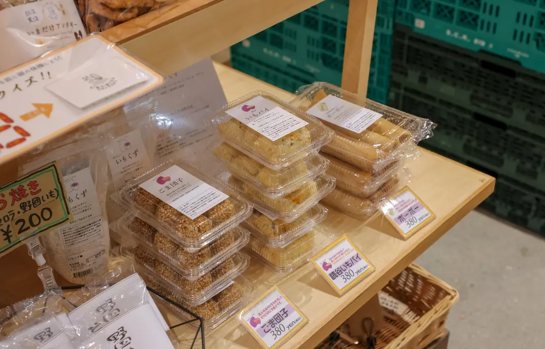 おススメは読谷村の特産品である紅芋からつくられたお菓子やスイーツ。クレープを巻きあげたような沖縄の昔ながらのおやつである「ポーポー」や「紅芋チップス」などが購入可能。